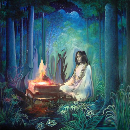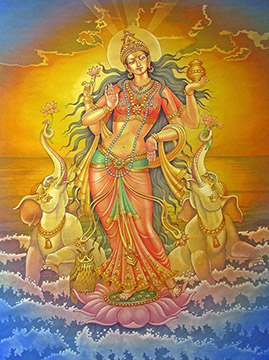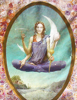 Painting by Paolo Polli 7. Anandarupam chitishaktidiptam vidyam param brahmarasanubhutim. Karunyapurnam gurumurtirupam devim namamah jagadishwarim twam. 7. The Form is bliss, the Force and light of awareness, the knowledge of silence, of the Absolute Brahman. Your Form is the Guru, full of compassion, We bow to You, Devi, Queen of the World. |
